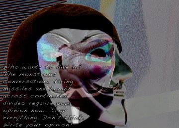 Who wants to dive in? The monstrous conversations firing missiles and bombs across continental divides require your opinion now. Drop everything. Don’t think. Write your opinion!